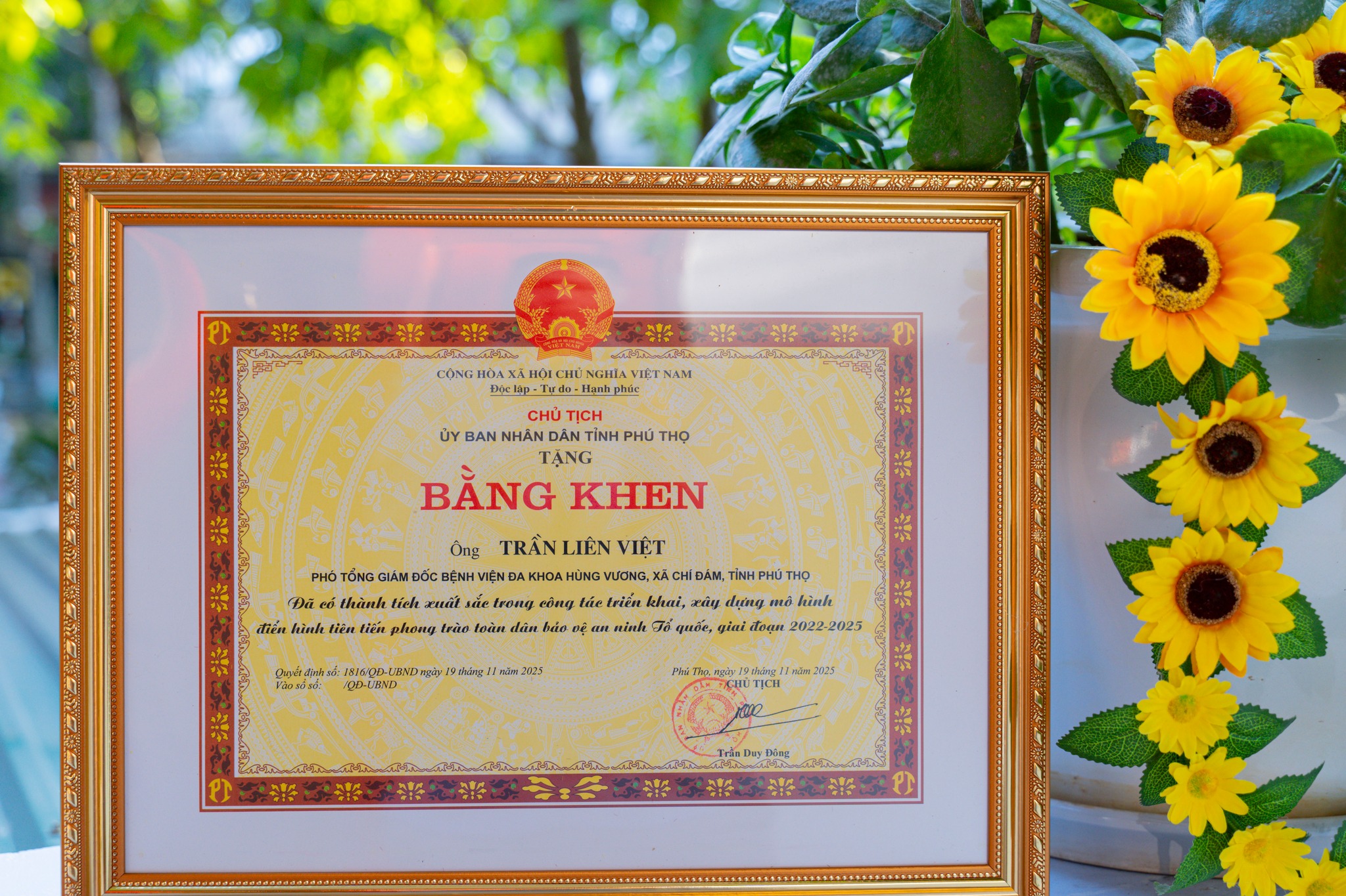 Bệnh viện Đa khoa Hùng Vương trân trọng chúc mừng Thạc sĩ Trần Liên Việt – Thành viên HĐTV, Phó Tổng Giám đốc Bệnh viện đã vinh dự được UBND tỉnh Phú Thọ trao tặng Bằng khen vì đã có thành tích xuất sắc trong công tác triển khai, xây dựng mô hình điển hình tiên tiến trong phong trào Toàn dân bảo vệ an ninh Tổ quốc giai đoạn 2022 – 2025.